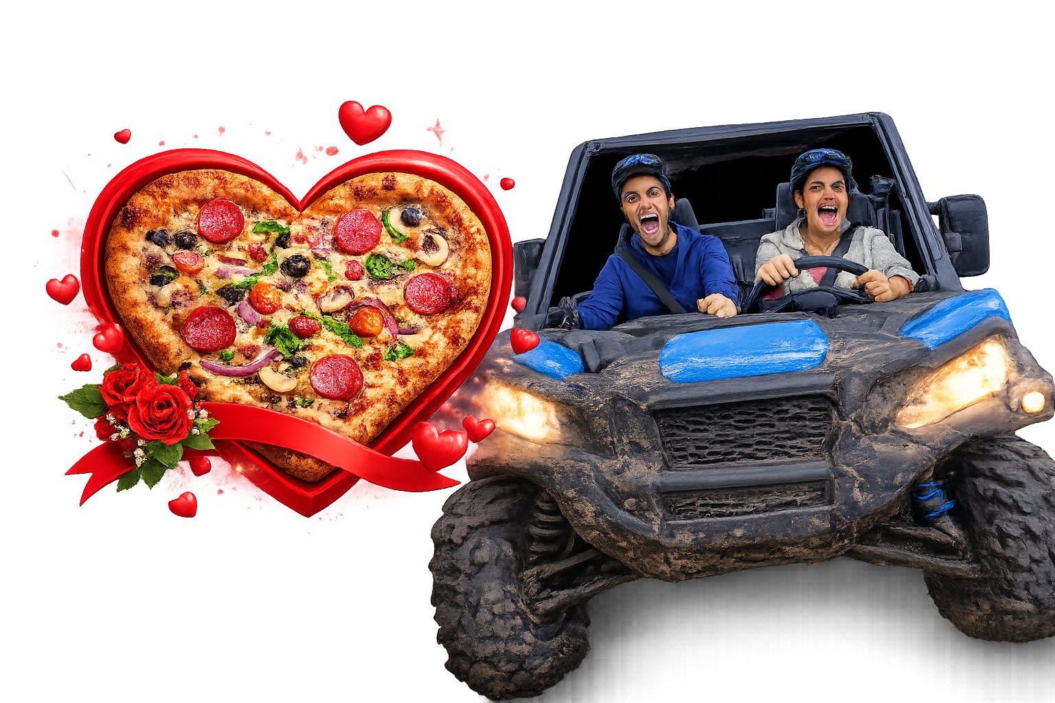 1 uur buggy rit special + glaasje bubbels + XL pizza to share